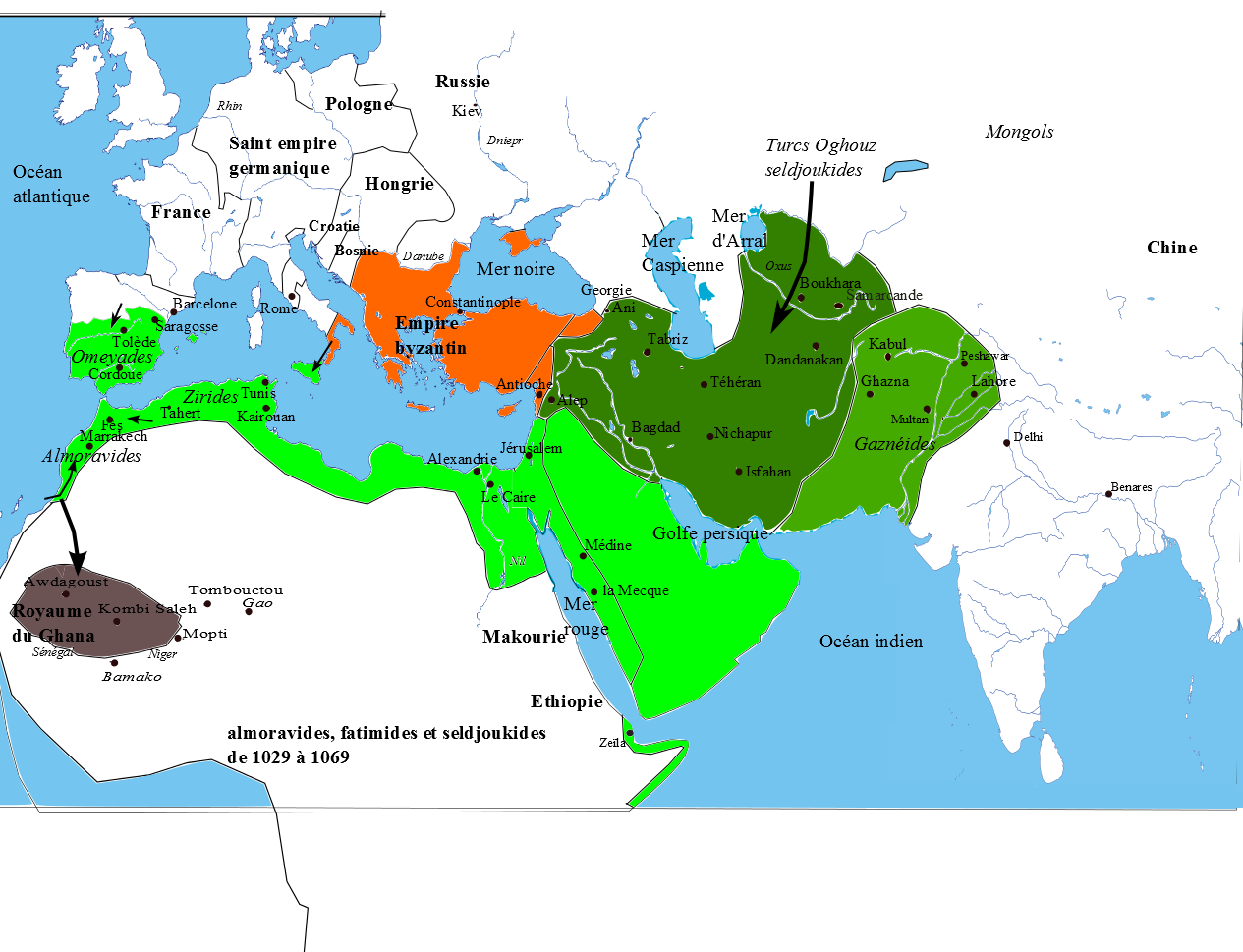 - Califat des seldjoukides (1064-1258) ils prennent le titre de sultan et le califat passe sous leur tutelle – moins tolérants que leurs prédécesseurs, ils interdisent l’accès aux lieux saints et persécutent les chrétiens, ce qui va déclencher les croisades