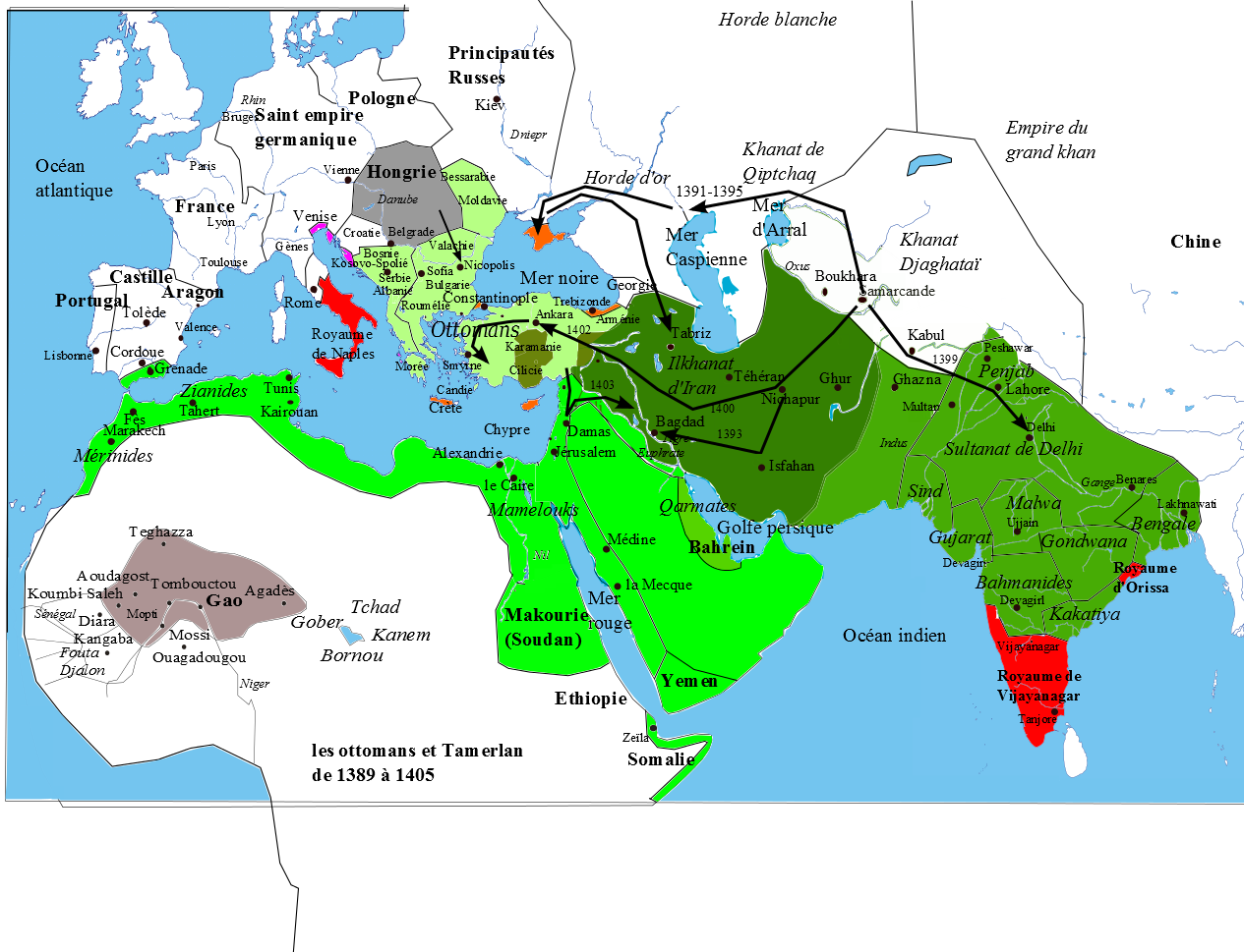 - 1400 Tamerlan prend Nichapour, traverse l’Iran, l’Anatolie, il bat les ottomans à Ankara (1402), prend Smyrne, ce qui fait lever le siège de Constantinople, puis il bat les mamelouks en Syrie (1403)