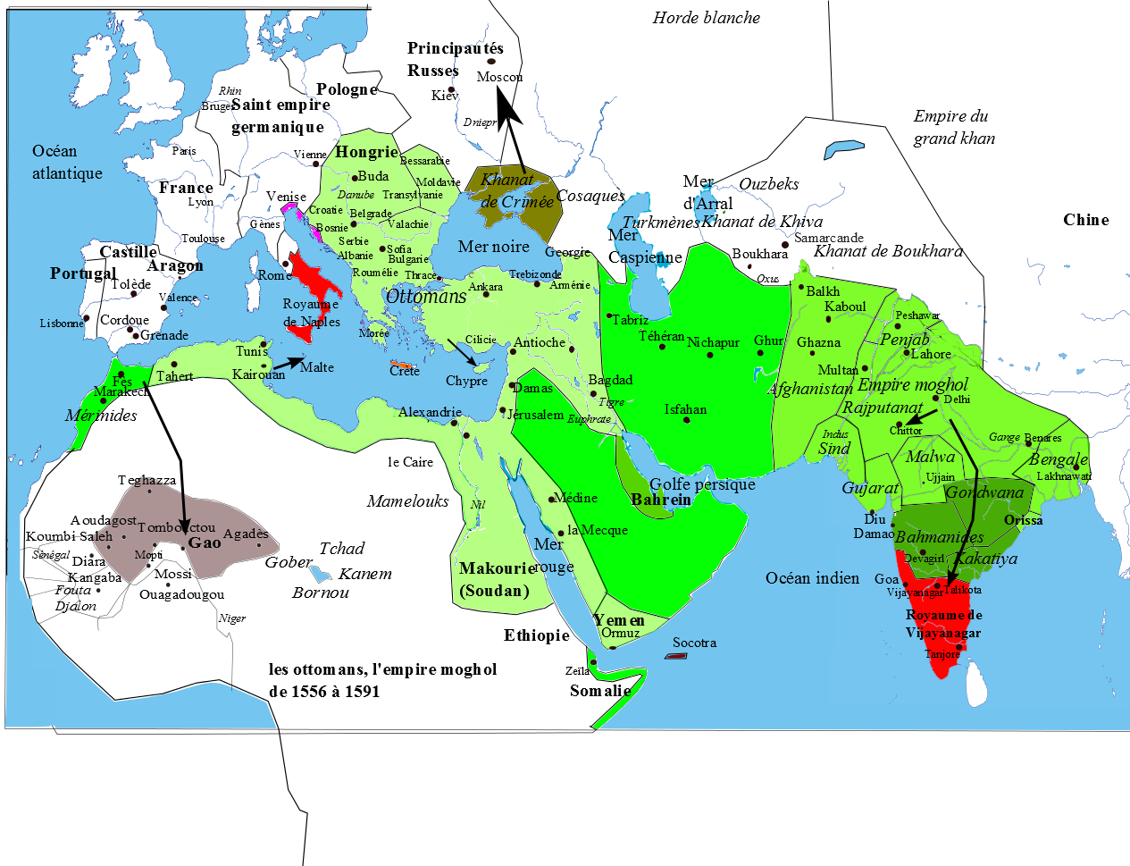- 1556-1605 Le moghol Akbar place sous son autorité le Pendjab, Rajputana, Gujarat, il conquiert le cachemire, le Sind et l’Orissa