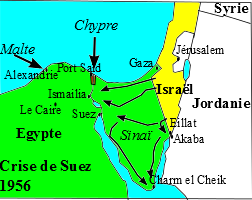 - 1956 Nasser, qui cherche à financer son projet de barrage à Assouan, se rapproche du bloc soviétique dont il reçoit de l’armement. Devant le refus de ses prêts par les américains et les soviétiques il nationalise le canal de Suez et bloque le golf d’Akaba aux navires israéliens. Les français lui reprochent son aide aux insurgés algériens. Les israéliens s’inquiètent de la modernisation de ses forces aériennes, grâce à l’aide soviétique. Et donc français et britanniques comptent le renverser. Israël, avec l’aide d’avions français déguisés, occupe le Sinaï et atteint le canal, la France et l’Angleterre lancent un ultimatum aux belligérants, les israéliens reculent de 10 km. Les alliés bombardent les aérodromes égyptiens et les paras français sautent près de l’aérodrome al Gamid. Les commandos britanniques débarquent à port Saïd. Le canal est sous contrôle et on s’apprête à marcher sur le Caire. L’URSS menace du feu nucléaire et fait cessez l’opération. Les anciennes nations colonisatrices doivent donc céder aux nouveaux maitres du monde, américains et soviétiques. L’ONU envoie des casques bleus.