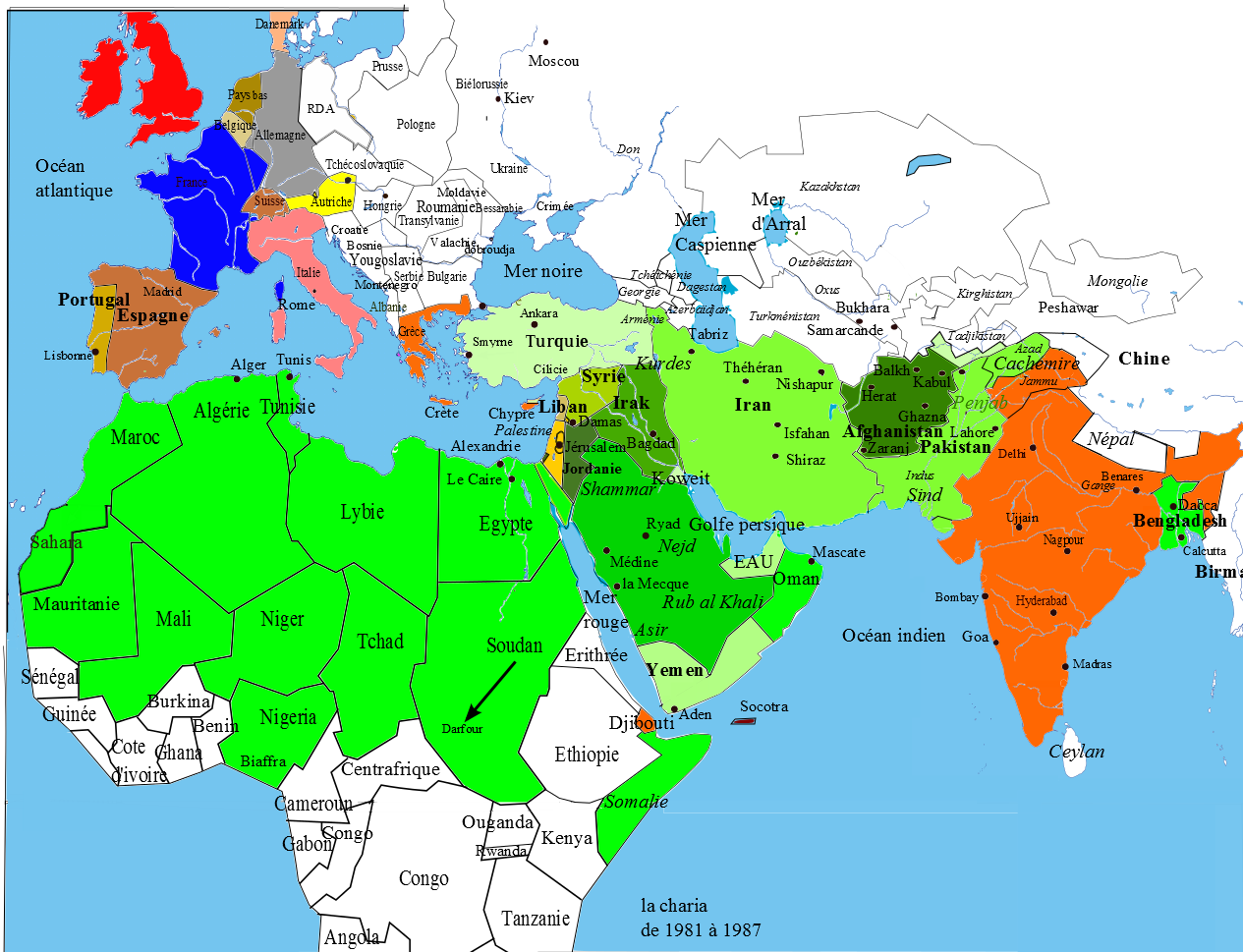 - 1983 : Application de la charia au Soudan; mains coupées, lapidations pour adultères; interdiction de l’alcool